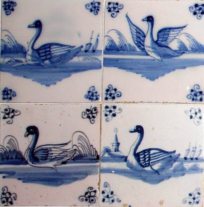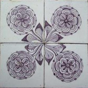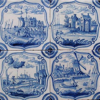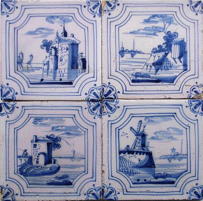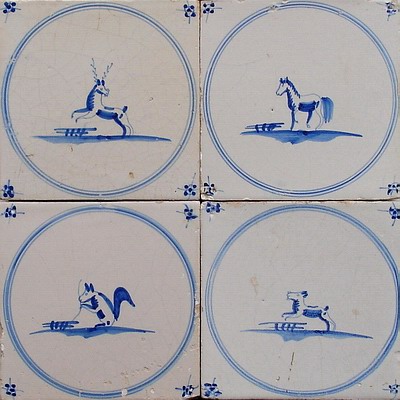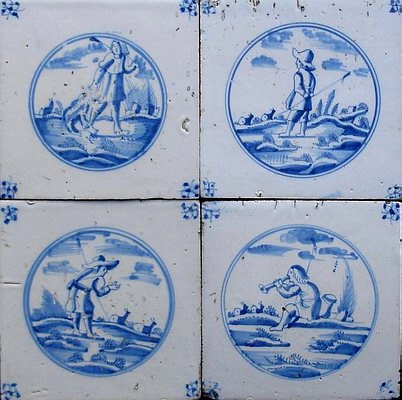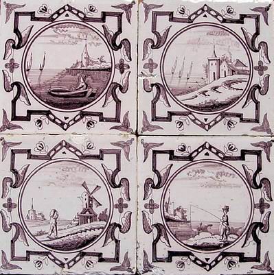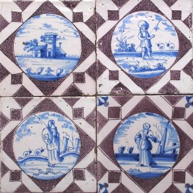 wohl Rotterdam, 1700 - 1770; drei Hirtenfliesen und eine Landschaftsfliese; Motiv jeweils blau im Kreis, ausgespart auf mangan gesprenkeltem Quadrat mit Vierecken im diagonalen Muster als Eckmotiv, unten rechts ergänzt mit Viertelrosette; letztere 1700 - 1730 |