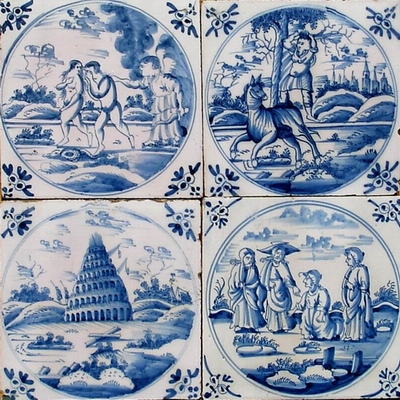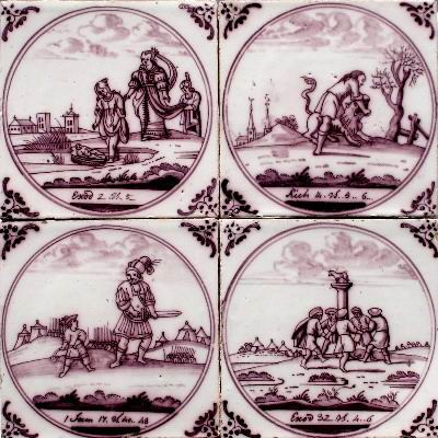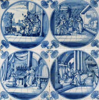 Amsterdam, um 1730; vier Bibelszenen (ein Brand); blau; Eckmotiv: Nelke: Das goldene Standbild von Nebukadnezar; Petrus heilt Äneas; die Verkündigung der Geburt von Johannes dem Täufer an Zacharias; der Pharisäer und der Zöllner |