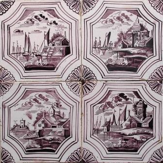 Makkum, 1780 - 1810; vier Uferlandschaften mit Gebäuden; in doppelt gebogenem Achteck; mangan; Eckmotiv: Viertelrosette (ein Brand) |