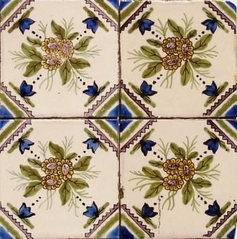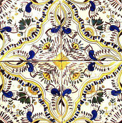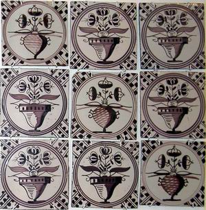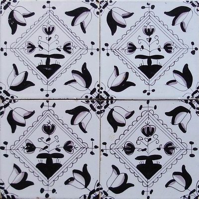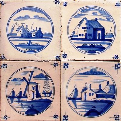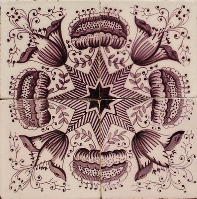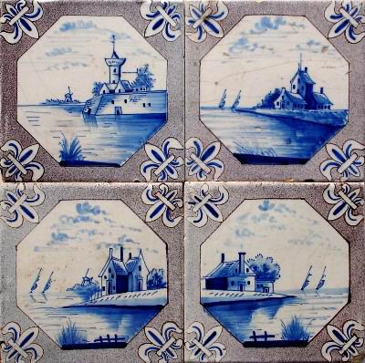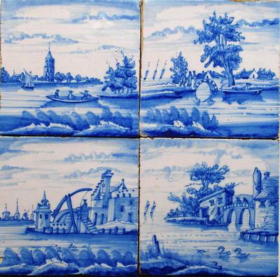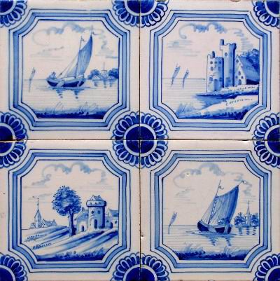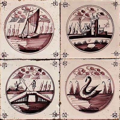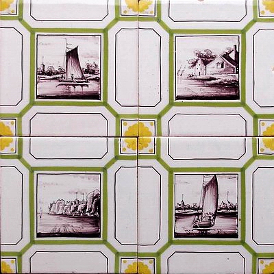 Harlingen, 1880 - 1930; vier Landschaften: zwei mit Segelboot und zwei mit Gebäuden; im Quadrat in halben Achtecken; mangan, grün und gelb; 13,2 x 13,2 x 0,8 cm (ein Brand) |