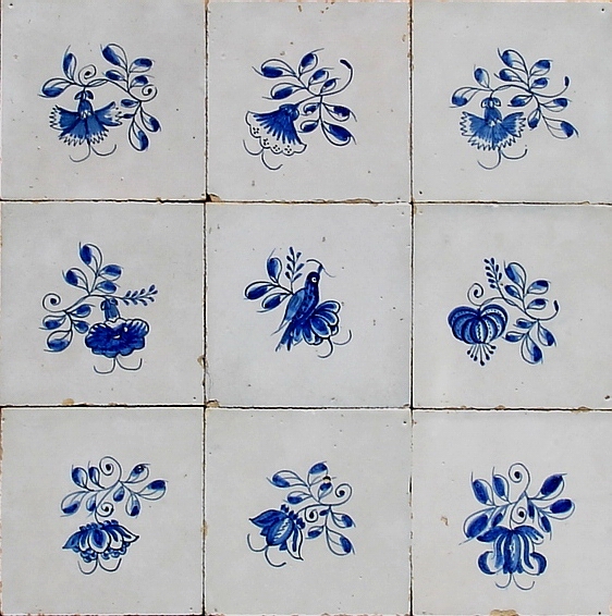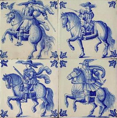 Harlingen oder Utrecht, ab 1880 (hier ca. Ende 19. Jhdt.); vier große Reiter, den Reitern der Periode 1700 bis 1750 nachempfunden; blau; Eckmotiv: Lilie; 13,1 x 13,1 x 0,8 cm (ein Brand) |