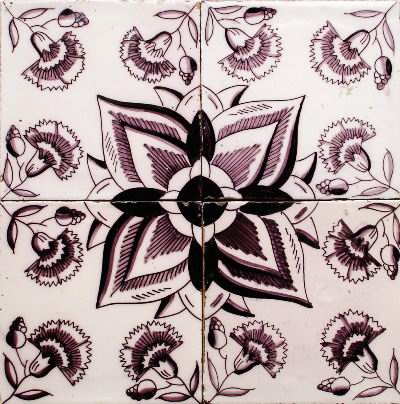1850 - 1920 (Ende 19. Jhdt.); dreiblütige Blume auf Rasenstück in Zackenraute mit Dreifaltigkeitssymbol an den Ecken; mangan; Eckmotiv: Lilie |