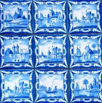 Utrecht, 1880 - 1910; neun Landschaften in quadratischer Rahmung mit Halbpalmetten; blau; 13,0 x 13,0 x 0,8 cm (ein Brand) |
