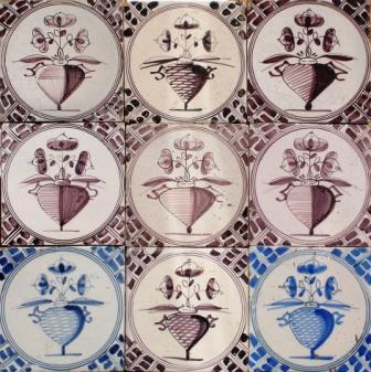 ab 1770 (1. Hälfte 19. Jhdt.); verschiedene Blumenvasen in unterschiedlichem Mangan und Blau; Eckmotiv: Wan-Li-Mäander |