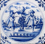 Biblische Szene, "die Kundschafter" (Num. XIII.23.); blau; Eckmotiv: Ochsenkopf; Rotterdam, Mitte 18. Jhdt., 12,8 x 12,8 x 0,8 cm; mit solchen Fliesen wurden häufig Kamine und Öfen verkleidet |