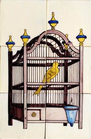 Gegen Ende des 19. Jahrhunderts lebte die traditionelle Fliesenproduktion zwar in Holland wieder auf, allerdings nur in wesentlich bescheidenerem Umfang. Die Schönheit und Einmaligkeit der handbemalten Fliesen blieb jedoch erhalten (Fliesenbild, bestehend aus 2 x 3 Fliesen á 13,2 x 13,2 x 0,8 cm: Vogelkäfig mit Kanarienvogel; polychrom; Utrecht, 2. Hälfte 19. Jhdt., vermutlich ca. 1875). |