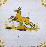 Beispiel einer deutschen "Delfter Fliese" aus Hannoversch Münden, bei der die individuelle Bemalung kaum noch Ähnlichkeiten mit der traditionellen Delfter Fliese aufweist: springender Rehbock; gelb mit schwarzen Umrisslinien; Eckmotiv: Viertelrosette; 1770; 12,7 x 12,8 x 0,6 cm; selten |