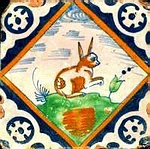 Hase; polychrom; Eckmotiv: sog. nierenförmige Maureske ("palmethoek"), in Ausspar- bzw. Reservetechnik aufgemalt; vermutlich Rotterdam, 1580 - 1625 (Anfang 17. Jhdt.); 13,6 x 13,6 x 1,5 cm |
