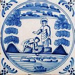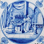 Biblical scene, the Annunciation of the birth of John the Baptist to Zachary (Luke I.11.); in large double circle; blue; corner motif: carnation; Amsterdam approx. 1750, 13,0 x 13,0 x 0,8 cm; with two nail holes in opposite corners, one above right and one below left, typical for tiles of the 18th c. |