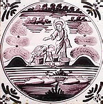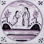 Biblical scene, Jesus heals a possessed man (Matthew IX.32 and XII.22.-24.; Luke II.14.,15.); in large double circle; purple; corner motif: spider; Harlingen 1880 - 1900, 13,0 x 13,0 x 0,8 cm; typically without nail holes |