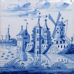 Landscape tile: windmill on town wall with dyke guard, in the background several buildings and in the foreground two swans in the reeds; painted accurate in every detail; blue; overall painting; Rotterdam, 1625 - 1650; 12,6 x 12,6 x 0,8 cm |
