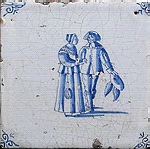 Patrician couple, she with a feather-fan hanging down her arm, he holding a large hat with two feathers in his hand, of those clothes are painted very artistic; blue with darker blue lines; corner motif: ox-head; approx. 1675; 13,0 x 13,0 x 1,0 cm; rare |