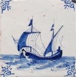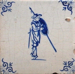 For example, see these two tiles with warriors: the soldiers are painted in similar outline (wearing a hat, holding a shield and lance, with a rapier at the hip), one looks to the right and one to the left (like a reflected image). Only the final painting is different; both blue with ox-head corner motifs; probably Rotterdam; 1630 - 1660; 13,0 x 13,0 x 1,1 cm |