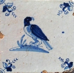 aber auch Schwäne, Enten, Gänse, Hähne und Hühner (Abb.: Adler; blau; Eckmotiv: Blüte; 1635 - 1660, 13,0 x 13,0 x 1,2 cm; selten; siehe unter "Eckmotive eine weitere sehr frühe Vogelabbildung von 1590 - 1625: Elster im Medaillon; polychrom; Eckmotiv: Viertelrosette in Ausspartechnik). |