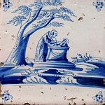 Weit verbreitet waren nicht zuletzt biblische Szenen. So wurden sage und schreibe seit ca. 1640 (vereinzelt lassen sich Fliesen mit Bibelmotiven, die polychrom bemalt sind, auch schon zu Beginn des 17. Jahrhunderts finden) ungefähr 600 verschiedene Motive des Alten und Neuen Testaments auf Fliesen festgehalten (Abb.: "Die Beschneidung Jesu", Lukas II.21.; blau; Eckmotiv: Spinne; Utrecht um 1720; 13,0 x 13,0 x 0,7 cm). |