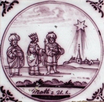 Eine Angabe zur betreffenden Textstelle aus der Bibel in Form eines kleinen gemalten Schildes unterhalb der abgebildeten Szene gibt es erstmals im 1. Viertel dieses Jahrhunderts (Abb.: "Die Weisen aus dem Morgenland auf dem Weg nach Bethlehem vom Stern geleitet", Matthäus II.9.,10.; mangan; Eckmotiv: Ochsenkopf; Rotterdam um 1770; 13,0 x 13, 0 x 0,7 cm). |