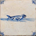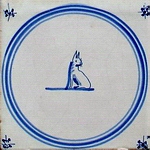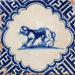 Besonders geschätzt waren nicht zuletzt Abbildungen einzelner Tiere (siehe weitere recht frühe Tierfliesen unter "Einleitung": Torbogenfliese mit springendem Fuchs und polychromes Motiv in maureskem Quadrat mit Hase sowie springender Hirsch in Akkoladenrahmung und mit Wan-Li-Eckmotiven; unter "Herstellung": Ziege in Zackenraute; unter "Eckmotive": Rotterdamer Kronenfliese und unter "Alterbestimmung": polychromes Tiermotiv in maureskem Quadrat, beide mit Fuchs).