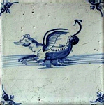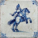 Gesondert zu erwähnen sind natürlich Reiter (Abb.: Reiter auf steigendem Pferd mit Hut; blau; Eckmotiv: Ochsenkopf; vermutlich Middelburg, 2. Hälfte 17. Jhdt.; 12,8 x 12,8 x 1,1 cm), die in der Phase von 1700 bis 1750 auffallend schön in Blau oder Mangan gemalt wurden, sog. "große Reiter", die in ähnlich gemalter Manier erneut gegen Ende des 19. Jahrhunderts auftraten. |