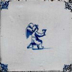Sie werden dargestellt in vielerlei Posen und mit allerlei Gerätschaften wie Pfeil und Bogen, Fackeln oder Bechern, aber auch mit Spielzeug und Musikinstrumenten u. v. mehr (Abb.: sitzender Engel mit Pokal; blau; Eckmotiv: Ochsenkopf; 1660 - 1700; 12,9 x 12,9 x 1,0 cm). |