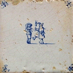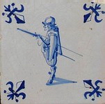 All diese Motive gehen häufig auf Zeichnungen von Jacob de Gheyn zurück, der Ende des 16. Jahrhunderts von Graf Johann VII. von Nassau-Siegen mit dem Verfassen eines Exerzierbuchs beauftragt wurde ("Wapenhandelinghe", 1607). Sie sind deshalb besonders ausdrucksstark und detailgetreu gemalt (siehe Abb.: Arkebusier mit Sturmhaube, in den Händen die schussbereite Muskete, an der Hüfte der Degen; blau; Eckmotiv: Lilie; vermutlich Delft, 1625 - 1660; 13,3 x 13,3 x 1,2 cm), |