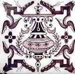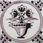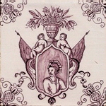 Solche Motive traten überwiegend im 18. und 19. Jahrhundert in Erscheinung. Die Bemalung war meist in Mangan gehalten (Abb.: Vase auf Kartusche mit Portrait eines Mannes und zwei Fahnen haltende Putten; mangan; Eckmotiv: Viertelrosette; Rotterdam, 1720 - 1770; 12,9 x 12,9 x 0,7 cm; selten). |