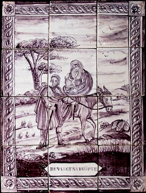 Zu finden sind eigentlich alle Motive der Einzelfliesen, wie biblische Szenen (Abb.: Flucht von Maria und Josef mit dem Jesuskind nach Ägypten, Matthäus II.14.; mangan; Utrecht, 2. Hälfte 19. Jhdt.; bestehend aus 3 x 4 Einzelfliesen, je 12,8 x 12,8 x 1,0 cm), mythologische Themen, Landschaften mit Gebäuden, aber auch kriegerische und bäuerliche Szenen, Alltagssituationen unter Darstellung von Einzelpersonen oder Personengruppen. |