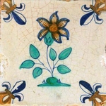 Die Blumenmotive, wie z. B. Kaiserkronen, Narzissen oder Tulpen sind deshalb sehr naturalistisch dargestellt (Abb.: Blume, polychrom; Eckmotiv: polychrome Lilie; vermutlich Gouda, 1620 - 1640; 13,0 x 13,0 x 1,2 cm). Im 18. und 19. Jahrhundert überwiegen hingegen stilisierte Blumen, wie die sog. Streublumen. |
