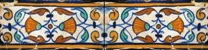 Die frühen Rand-Fliesen (1570 - 1650) sind entsprechend der Farbgebung früher Fliesenmotive polychrom (Abb.: zwei Rand-Fliesen mit Ringelblumen und Flügelblättern; polychrom; 1610 - 1640; 6,8 x 13,8 x 1,6 cm), |