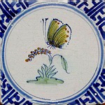 zuweilen selbst Raupen, und zwar oft in Verbindung mit Blumen und Pflanzen (Abb.: Schmetterling über Blume im Medaillon; polychrom; Eckmotiv: Wan-Li-Mäander; Harlingen, 1630 - 1650; 13,0 x 13,0 x 1,2 cm, selten). |
