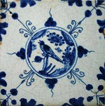 Kopiert wurden aber auch Darstellungen von Vögeln, Insekten und Blumen - sog. chinesischer Garten (siehe Abb.: chinesischer Garten im kleinen Doppel-Kreis mit "Aigretten" = Federbüschel; blau; Eckmotiv: Dreifaltigkeitssymbol; wohl Rotterdam oder Haarlem, 1620 - 1650; 13,0 x 13,0 x 1,1 cm) - bis hin zu figürlichen Szenen sowie einzelnen Figuren in ihrer typischen chinesischen Tracht und in traditioneller Pose. |