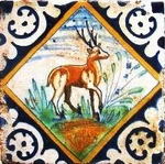 Von 1570 bis in das erste Viertel des 17. Jahrhundert sind die "Tierfliesen" polychrom. Das Tiermotiv befindet sich entweder in einem mauresken Quadrat mit Palmetteneckmotiv oder in breitem Kreis (italienisches Medaillon) mit umgekehrter Rosette als Eckmotiv (Abb.: Hirsch in maureskem Quadrat; polychrom; Eckmotiv: Palmette; 1580 - 1625, ca. 1610; 13,2 x 13,2 x 1,5 cm). |