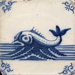 Polychrome bzw. blaue Fischmotive wurden bereits in der 1. Hälfte des 17. Jahrhunderts gemalt. Die typischen Darstellungen stammen jedoch aus der 2. Hälfte des 17. und der 1. Hälfte des 18. Jahrhunderts (Abb.: Fisch; blau; Eckmotiv: Ochsenkopf; 18. Jhdt.; 13,0 x 13,0 x 0,8 cm). |
