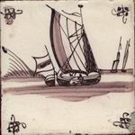 So waren sehr beliebt maritime Motive wie Schiffe, Fische und andere Meerestiere, was für eine Seefahrernation mit einer riesigen Handels-, Kriegs- und Fischereiflotte naheliegend erscheint (Abb.: Fischkutter; mangan; Eckmotiv: Spinne; Provinz Holland, Delft oder Rotterdam, 18. Jhdt.; 13,0 x 13,0 x 0,8 cm). |