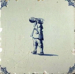 Häufig sind abgebildet alle Arten Händler oder Marktfrauen, Handwerker unterschiedlichster Zunft, Fischer, Bauern, Jäger und vor allem Hirten, aber auch Geistliche oder Juristen (Abb.: Schäferin vor stilisierter Landschaft mit zwei Schafen im Hintergrund; blau; Eckmotiv: Spinne; vermutlich Friesland, 18. Jhdt.; 13,0 x 13,0 x 0,8 cm). |