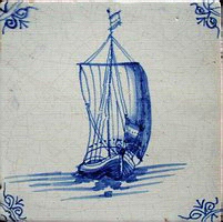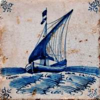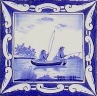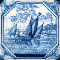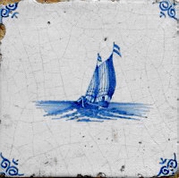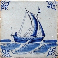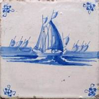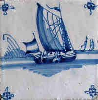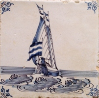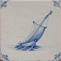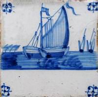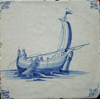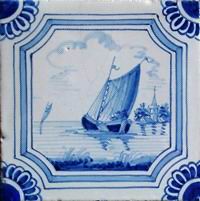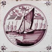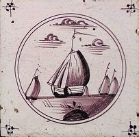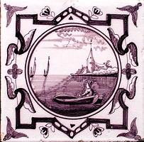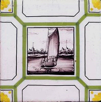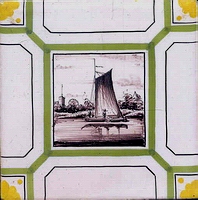 Fischkutter im Quadrat in halben Achtecken; mangan, grün und gelb; 13,2 x 13,2 x 0,8 cm / Fishing trawler in a square in half octagons; purple, green and yellow; 13,2 x 13,2 x 0,8 cm |