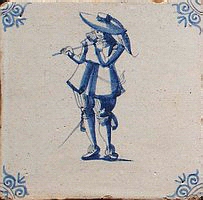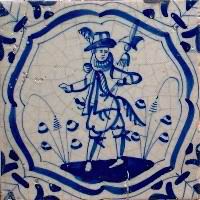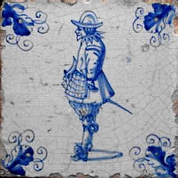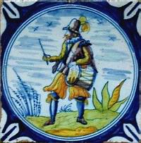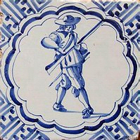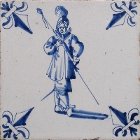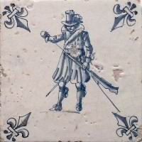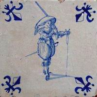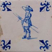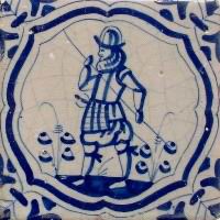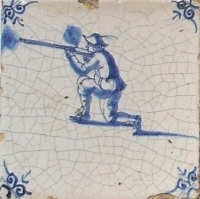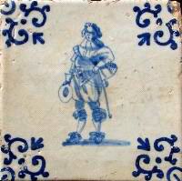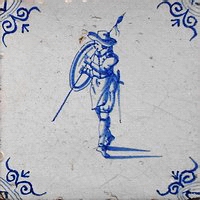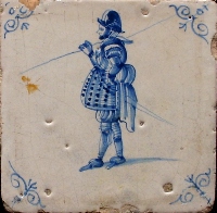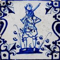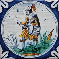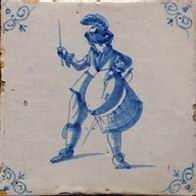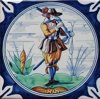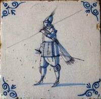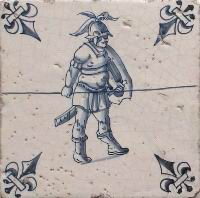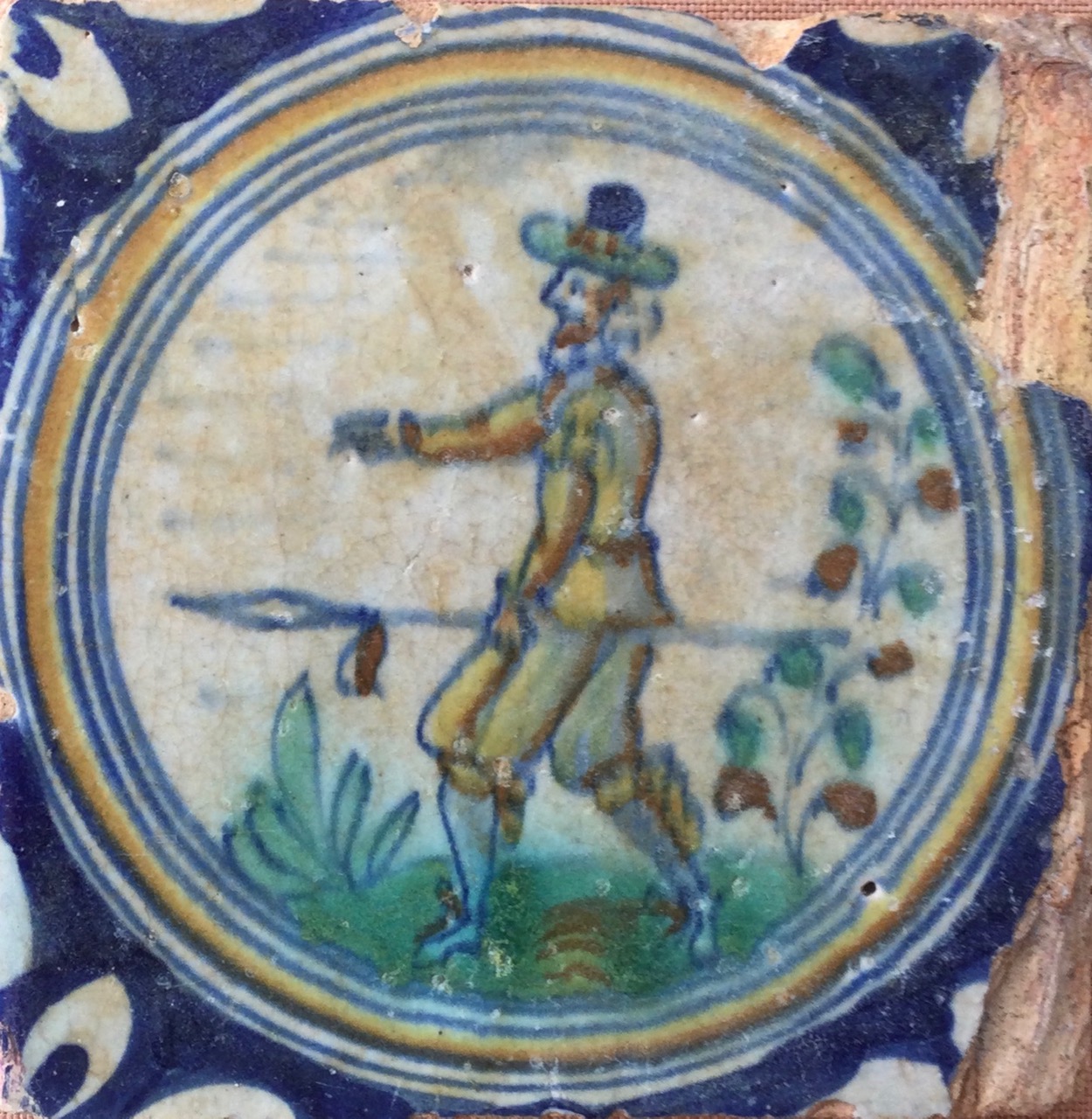 Soldat mit Spieß in italienischem Medaillon; polychrom; Eckmotiv: Viertelrosette in Ausspartechnik; ursprünglich 13,4 x 13,4 x 1,5 cm / Soldier with spear in Italian circle band; polychrome; corner motif: qwuarter rosette in reserv; original size 13,4 x 13,4 x 1,5 cm |
