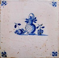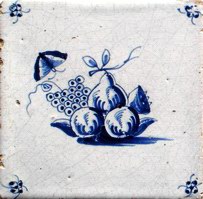 Früchtestilleben; blau; Eckmotiv: Spinne; 13,2 x 13,2 x 1,2 cm / Still